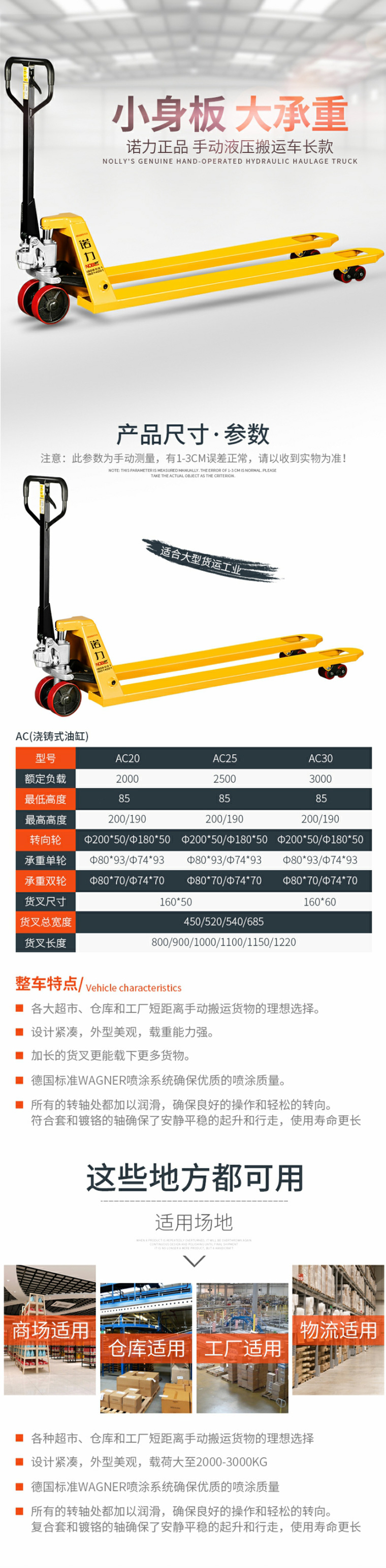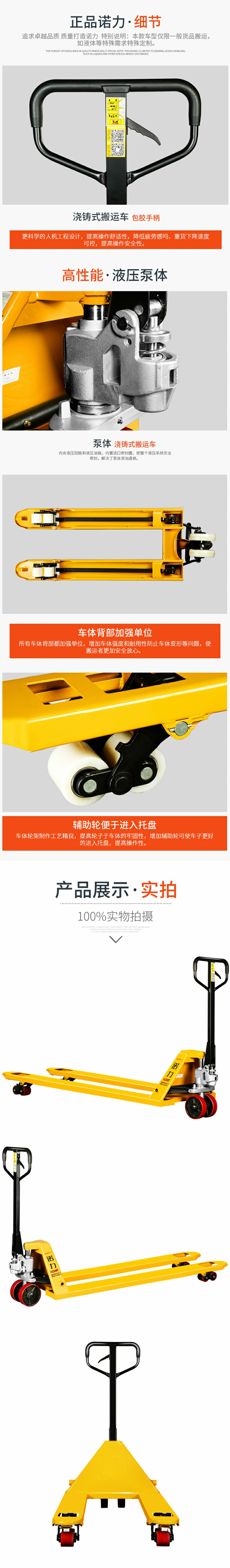 手動托(tuo)盤搬運車俗稱地(di)牛,車底盤與輪之(zhi)間有液壓裝置,可(ke)以方便的将車推(tuī)入貨箱底座之下(xià),然後用液壓将底(dǐ)盤升高,托起貨物(wu)。搬運車手柄設計(ji)符合人體工程學(xue)原理,具有提升、搬(ban)運、放下三大功能(néng)。