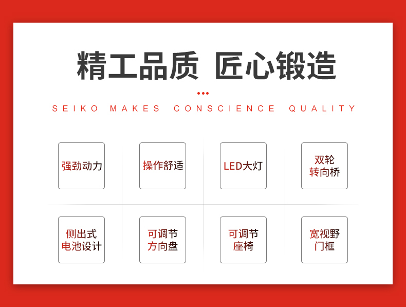 産品賣(mai)點 整車(chē)AC交流免(mian)維護 高(gao)性能蓄(xù)電池 雙(shuāng)輪結構(gòu)轉向橋(qiao) 多♈重舒(shū)适設計(jì)駕駛更(gèng)輕松 LED大(da)燈 寬敞(chang)視野門(mén)框 前橋(qiao)驅動