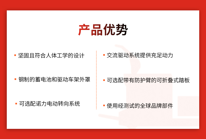 經濟型電動搬(bān)運車 産品賣點 堅(jiān)固且符合人體工(gōng)學💚設計 鋼💜制的蓄(xu)電車和驅動車架(jia)外罩 可選配諾力(li)電動轉向系統 交(jiāo)♈流驅動系統提供(gòng)充足動力 可選配(pei)帶有防護臂的可(ke)折疊式踏闆 使用(yòng)經測試的全球品(pin)牌部件
