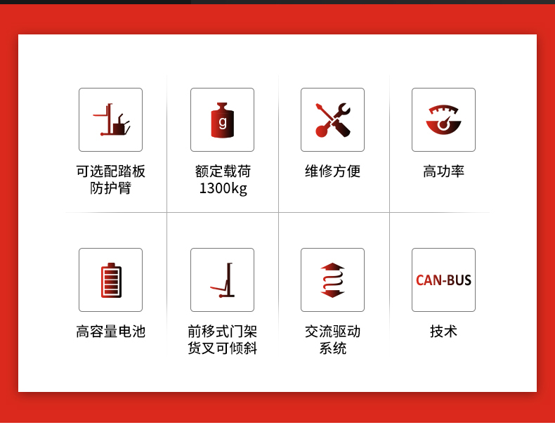 産(chǎn)品賣點 高容(rong)量電池 交流(liú)驅動技術 貨(huo)叉可傾斜 選(xuǎn)配📱側移功能(neng) 選配側拉式(shi)電池
