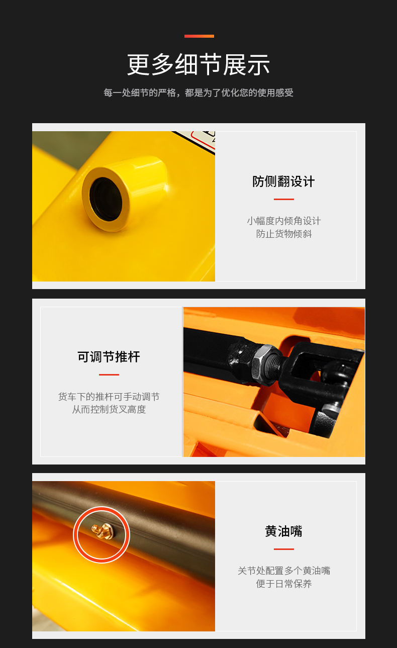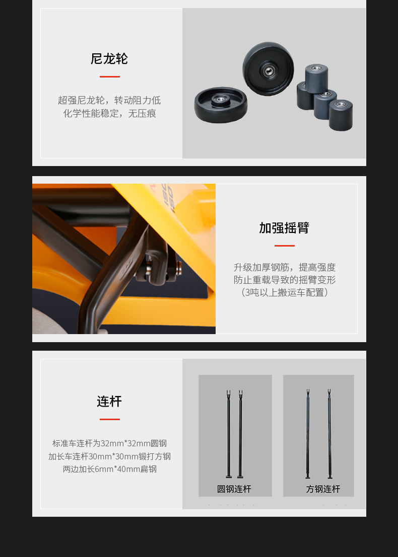 産品賣點 設計(ji)出衆,品質的搬(ban)運車 是各種超(chao)市、倉庫和🙇🏻工廠(chǎng)段距離手動搬(bān)運貨物的理想(xiǎng)選擇材料選用(yòng)加強🌈型剛🌏才,堅(jiān)固耐用,外形精(jīng)緻美觀;德國标(biao)準WAGNER噴塗系統确(què)‼️保噴塗㊙️質量所(suo)✍️有的轉向軸處(chu)都加以潤滑,确(que)保良好的操作(zuo)性和輕松的轉(zhuan)向;複合套和鍍(dù)鉻軸确保了安(an)靜平穩的起升(sheng)和行走,延長使(shi)用壽命