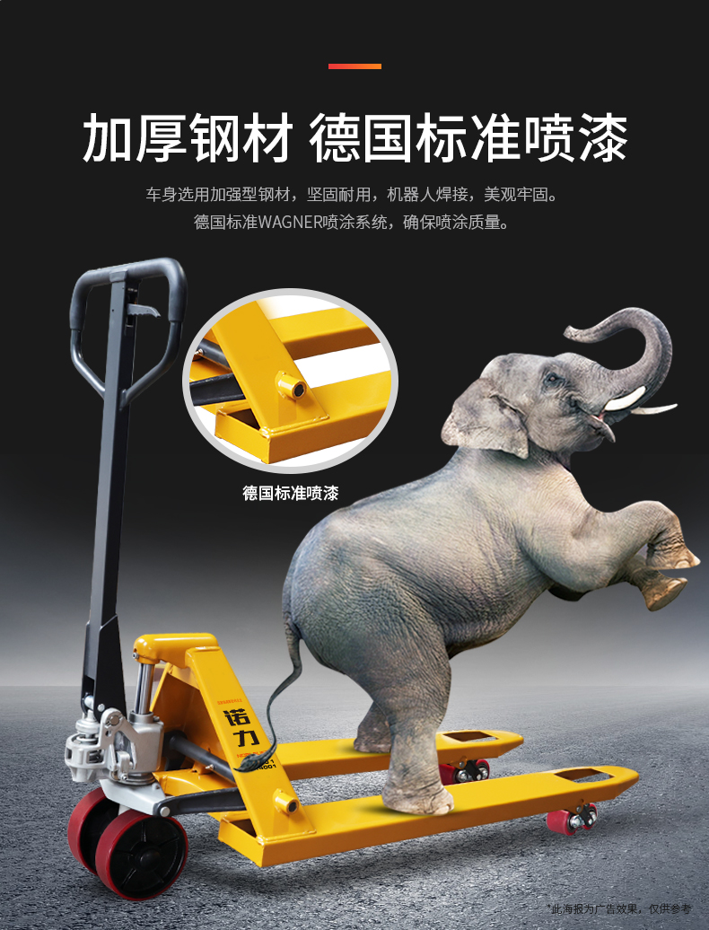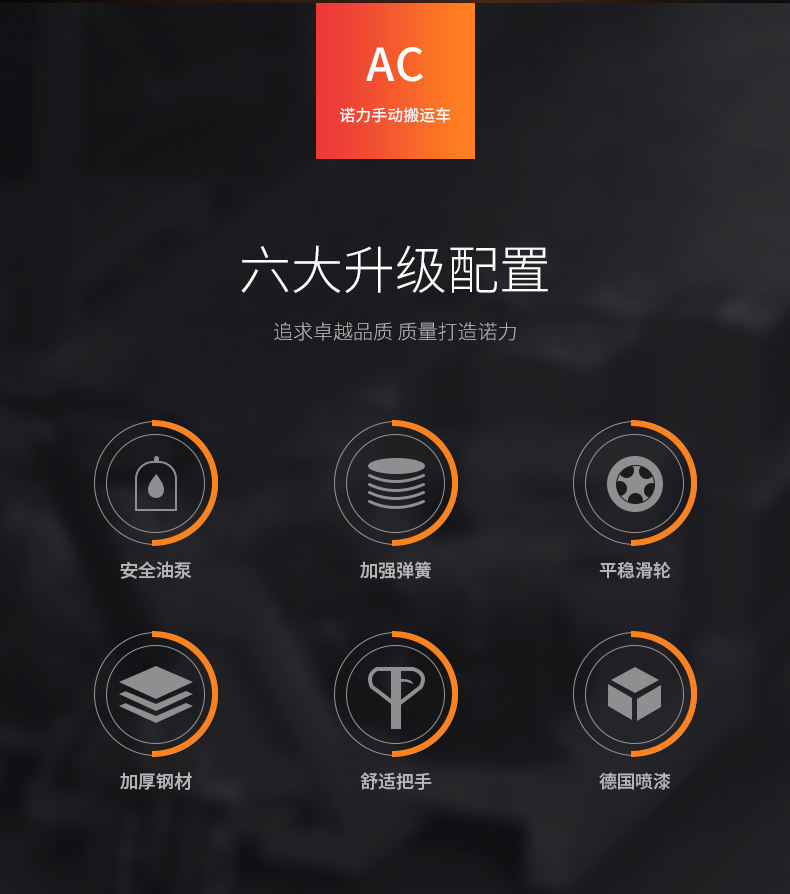 産品賣點 精簡(jiǎn)耐用,匠心品質(zhì)的搬運車 是各(ge)種超市、倉庫和(he)工廠段距離手(shǒu)動搬運貨物的(de)理想選擇 材料(liào)選用加強型鋼(gāng)🌂材,堅🔞固耐用,外(wài)形精緻美觀。德(dé)國标準WAGNER噴塗系(xi)統确保的噴塗(tú)質量 所有的轉(zhuan)軸處🙇♀️都加以潤(run)滑,确保良⛹🏻♀️好的(de)操作性和輕松(sōng)✂️的轉向。複合套(tao)和鍍鉻的軸确(que)保了安靜平穩(wen)的起升和行走(zou),是用壽命長